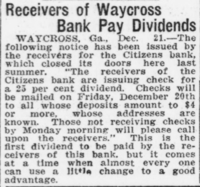 Receivers of Waycross Bank Pay Dividends WAYCROSS, Ga., Dec. 21.-The following notice has been issued by the receivers for the Citizens bank, which closed its doors here last summer. "The receivers of the Citizens bank are issuing check for a 25 per cent dividend. Checks will be mailed on Friday, December 20th to all whose deposits amount to $4 or more, whose addresses are known. Those not receiving checks by Monday morning will please call upon the receivers." This is the first dividend to be paid by the receivers of this bank. but it comes at a time when almost every one can use a little change to a good advantage.