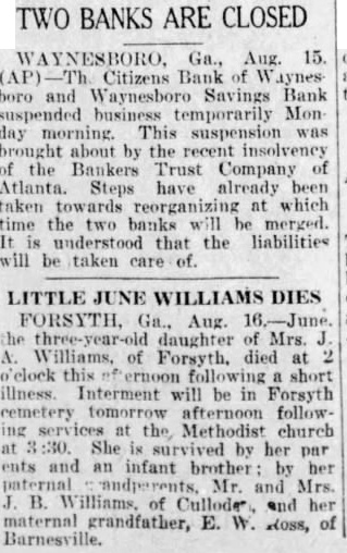 TWO BANKS ARE CLOSED AYNESBORO. Ga., Aug. 15. Citizens Bank Waynes boro and Waynesboro Savings Bank temporarily Mon day morning. suspension by Bankers Trust Company have already reorganizing which time the banks merged. that the liabilities will be taken of. LITTLE WILLIAMS DIES Ga., Aug. daughter Mrs. Williams, of Forsyth, died o'elock this illness Interment will be in Forsyth the Methodist church She by her par and an infant by her Mr. and Mrs. of and her maternal grandfather, E. W. of Barnesville.