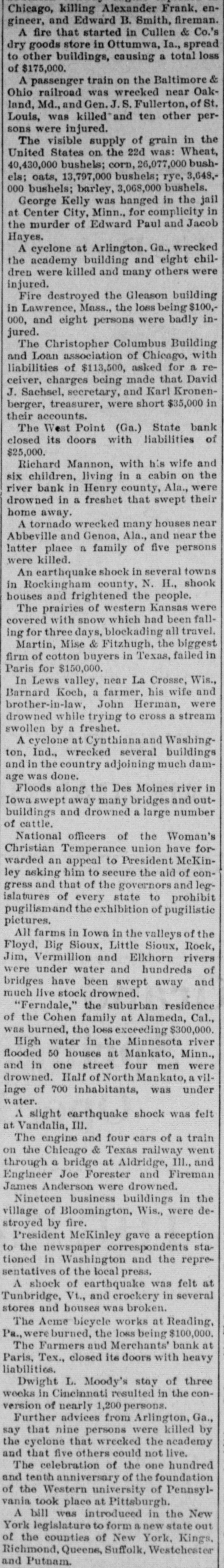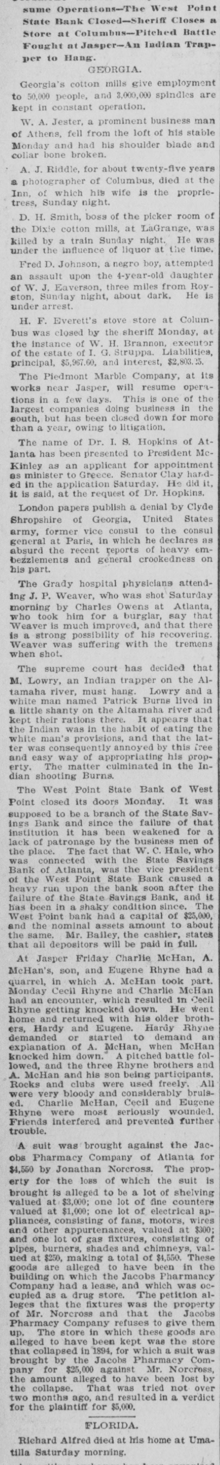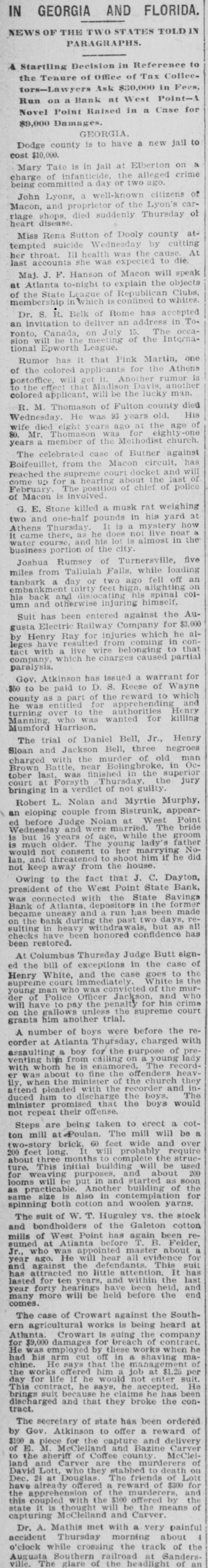IN GEORGIA AND FLORIDA. NEWS OF THE TWO ATES TOLD PARAGRAPHS. & Startling Decision in Reference to the Tenure of Office of Tax Colleetors-Lawyers Ask $30,000 in Fees, Run on a Bank at West Point-A Novel Point Raised in a Case for $9,000 Damages. GEORGIA. Dodge county is to have a new jall to cost $10,000. Mary Tate is in jail at Elberton on a charge of infanticide, the alleged crime being committed a day or two ago. John Lyons, a well-known citizens of Macon, and proprietor of the Lyon's carriage shops, died suddenly Thursday of heart disease. Miss Rena Sutton of Dooly county attempted suicide Wednesday by cutting her throat. Ill health was the cause. At last accounts she was expected to die. Maj. J. F. Hanson of Macon will speak at Atlanta to-night to explain the objects of the State League of Republican Clubs, membership in which is confined to whites. Dr. S. R. Belk of Rome has accepted an invitation to deliver an address in Toronto, Canada, on July 15. The occasion will be the meeting of the International Epworth League. Rumor has it that Pink Martin, one of the colored applicants for the Athens postoffice, will get it. Another rumor is the effect that Madison Davis, another colored applicant, will be the lucky man. R. M. Thomason of Fulton county died Wednesday. He was 93 years old. His wife died eight years ago at the age of 80. Mr. Thomason was for eighty one years a member of the Methodist church. The celebrated case of Butner against Boifeuillet, from the Macon circuit, has reached the supreme court docket and will come up for a hearing about the last of February The position of chief of police of Macon is involved. G. E. Stone killed a musk rat weighing two and one-half pounds in his yard at Athens Thursday. It is a mystery how it came there, as he does not live near water course, and his lot is almost in the business portion of the city. Joshua Rumsey of Turnersville, five miles from Tallulah Falls, while loading tanbark a day or two ago fell off an embankment thirty feet hign, alighting on his back and dislocating his spinal COIumn and otherwise injuring himself. Suit has been entered against the Augusta Electric Railway Company for $3.000 by Henry Ray for injuries which he alleges have resulted from coming in contact with a live wire belonging to that company, which he charges caused partial paralysis. Gov. Atkinson has issued a warrant for $50 to be paid to D. S. Reese of Wayne county as a part of the reward to which he was entitled for apprehending and turning over to the authorities Henry Manning, who was wanted for killing Mumford Harrison. The trial of Daniel Bell, Jr., Henry Sloan and Jackson Bell, three negroes charged with the murder of old man Brown Battle, near Bolingbroke, in October last, was finished in the superior court at Forsyth Thursday the jury bringing in a verdict of not guilty. Robert L. Nolan and Myrtie Murphy, an eloping couple from Sistrunk, appeared before Judge Nolan at West Point Wednesday and were married. The bride is but 16 years of age, while the groom is much older. The young lady's father would not consent to her marrying Nolan, and threatened to shoot him if he did not keep away from the house. Owing to the fact that J. C. Dayton, president of the West Point State Bank, was connected with the State Savings Bank of Atlanta, depositors in the former became uneasy and a run has been made on the bank during the past two days, resulting in heavy withdrawals, but as all checks have been honored confidence has been restored. At Columbus Thursday Judge Butt signed the bill of exceptions in the case of Henry White, and the case goes to the supreme court immediately. White is the young man who was convicted of the murder of Police Officer Jackson, and who will have to pay the penalty for his crime on the gallows unless the supreme court grants him another trial. A number of boys were before the recorder at Atlanta Thursday, charged with assaulting a boy for the purpose of preventing him from calling on a young lady with whom he is enamored. The recorder was about to fine the offenders heavily, when the minister of the church they attend pleaded with the recorder and induced him to discharge the boys. The minister promised that the boys would not repeat their offense. Steps are being taken to erect a cotton mill at Poulan. The mill will be a two-story brick, 60 feet wide and over 200 feet long. It will probably require about three months to complete the strueture. This initial building will be used for weaving purposes, and about 200 looms will be put in and started as soon as practicable. Another building of the same size is also in contemplation for spinning both cotton and woolen yarns. The suit of W. T. Huguley vs. the stock and bondholders of the Galeton cotton mills of West Point has again been resumed at Atlanta before T. B. Felder, Jr., who was appointed master about a year ago. He will hear all evidence for and against the defendants. This suit has attracted no little attention. It has lasted for ten years, and within the last year forty hearings have been held, and many more will be held before the end comes. The case of Crowart against the Southern agricultural works is being heard at Atlanta. Crowart is suing the company for $9,000 damages for breach of contract. He was employed by these works when he had his arm cut off in a shaving machine. He says that the management of the works offered him a job at $1.25 per day for life if he would not enter suit. This contract, he says, he accepted. He brings suit he claims he has been discharged and that they broke the contract. The secretary of state has been ordered by Gov. Atkinson to offer a reward of $100 a piece for the capture and delivery of E. M. McClelland and Bazine Carver to the sheriff of Coffee county McClelland and Carver are the murderers of David Lott, who they stabbed to death on Dec. 24 at Douglas The friends of Lott have already offered a reward of $300 for the apprehension of t