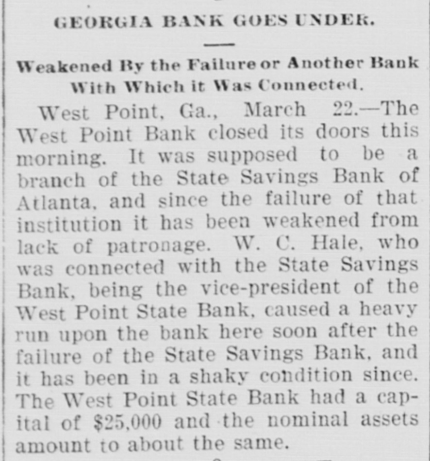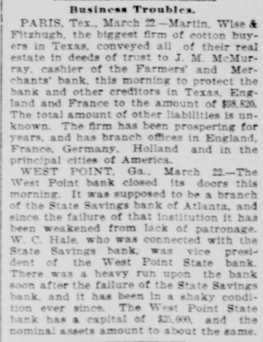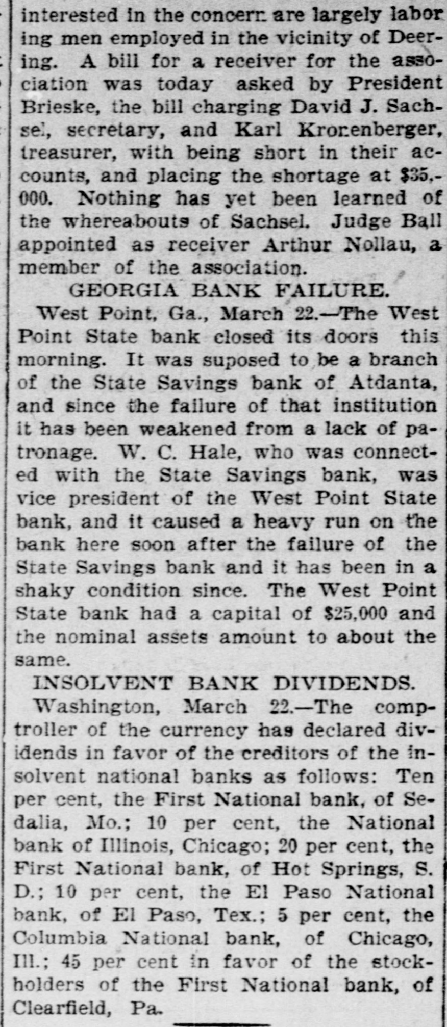 IN GEORGIA AND FLORIDA. NEWS OF THE TWO ATES TOLD PARAGRAPHS. & Startling Decision in Reference to the Tenure of Office of Tax Colleetors-Lawyers Ask $30,000 in Fees, Run on a Bank at West Point-A Novel Point Raised in a Case for $9,000 Damages. GEORGIA. Dodge county is to have a new jall to cost $10,000. Mary Tate is in jail at Elberton on a charge of infanticide, the alleged crime being committed a day or two ago. John Lyons, a well-known citizens of Macon, and proprietor of the Lyon's carriage shops, died suddenly Thursday of heart disease. Miss Rena Sutton of Dooly county attempted suicide Wednesday by cutting her throat. Ill health was the cause. At last accounts she was expected to die. Maj. J. F. Hanson of Macon will speak at Atlanta to-night to explain the objects of the State League of Republican Clubs, membership in which is confined to whites. Dr. S. R. Belk of Rome has accepted an invitation to deliver an address in Toronto, Canada, on July 15. The occasion will be the meeting of the International Epworth League. Rumor has it that Pink Martin, one of the colored applicants for the Athens postoffice, will get it. Another rumor is the effect that Madison Davis, another colored applicant, will be the lucky man. R. M. Thomason of Fulton county died Wednesday. He was 93 years old. His wife died eight years ago at the age of 80. Mr. Thomason was for eighty one years a member of the Methodist church. The celebrated case of Butner against Boifeuillet, from the Macon circuit, has reached the supreme court docket and will come up for a hearing about the last of February The position of chief of police of Macon is involved. G. E. Stone killed a musk rat weighing two and one-half pounds in his yard at Athens Thursday. It is a mystery how it came there, as he does not live near water course, and his lot is almost in the business portion of the city. Joshua Rumsey of Turnersville, five miles from Tallulah Falls, while loading tanbark a day or two ago fell off an embankment thirty feet hign, alighting on his back and dislocating his spinal COIumn and otherwise injuring himself. Suit has been entered against the Augusta Electric Railway Company for $3.000 by Henry Ray for injuries which he alleges have resulted from coming in contact with a live wire belonging to that company, which he charges caused partial paralysis. Gov. Atkinson has issued a warrant for $50 to be paid to D. S. Reese of Wayne county as a part of the reward to which he was entitled for apprehending and turning over to the authorities Henry Manning, who was wanted for killing Mumford Harrison. The trial of Daniel Bell, Jr., Henry Sloan and Jackson Bell, three negroes charged with the murder of old man Brown Battle, near Bolingbroke, in October last, was finished in the superior court at Forsyth Thursday the jury bringing in a verdict of not guilty. Robert L. Nolan and Myrtie Murphy, an eloping couple from Sistrunk, appeared before Judge Nolan at West Point Wednesday and were married. The bride is but 16 years of age, while the groom is much older. The young lady's father would not consent to her marrying Nolan, and threatened to shoot him if he did not keep away from the house. Owing to the fact that J. C. Dayton, president of the West Point State Bank, was connected with the State Savings Bank of Atlanta, depositors in the former became uneasy and a run has been made on the bank during the past two days, resulting in heavy withdrawals, but as all checks have been honored confidence has been restored. At Columbus Thursday Judge Butt signed the bill of exceptions in the case of Henry White, and the case goes to the supreme court immediately. White is the young man who was convicted of the murder of Police Officer Jackson, and who will have to pay the penalty for his crime on the gallows unless the supreme court grants him another trial. A number of boys were before the recorder at Atlanta Thursday, charged with assaulting a boy for the purpose of preventing him from calling on a young lady with whom he is enamored. The recorder was about to fine the offenders heavily, when the minister of the church they attend pleaded with the recorder and induced him to discharge the boys. The minister promised that the boys would not repeat their offense. Steps are being taken to erect a cotton mill at Poulan. The mill will be a two-story brick, 60 feet wide and over 200 feet long. It will probably require about three months to complete the strueture. This initial building will be used for weaving purposes, and about 200 looms will be put in and started as soon as practicable. Another building of the same size is also in contemplation for spinning both cotton and woolen yarns. The suit of W. T. Huguley vs. the stock and bondholders of the Galeton cotton mills of West Point has again been resumed at Atlanta before T. B. Felder, Jr., who was appointed master about a year ago. He will hear all evidence for and against the defendants. This suit has attracted no little attention. It has lasted for ten years, and within the last year forty hearings have been held, and many more will be held before the end comes. The case of Crowart against the Southern agricultural works is being heard at Atlanta. Crowart is suing the company for $9,000 damages for breach of contract. He was employed by these works when he had his arm cut off in a shaving machine. He says that the management of the works offered him a job at $1.25 per day for life if he would not enter suit. This contract, he says, he accepted. He brings suit he claims he has been discharged and that they broke the contract. The secretary of state has been ordered by Gov. Atkinson to offer a reward of $100 a piece for the capture and delivery of E. M. McClelland and Bazine Carver to the sheriff of Coffee county McClelland and Carver are the murderers of David Lott, who they stabbed to death on Dec. 24 at Douglas The friends of Lott have already offered a reward of $300 for the apprehension of t