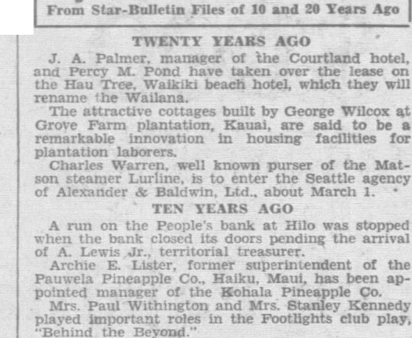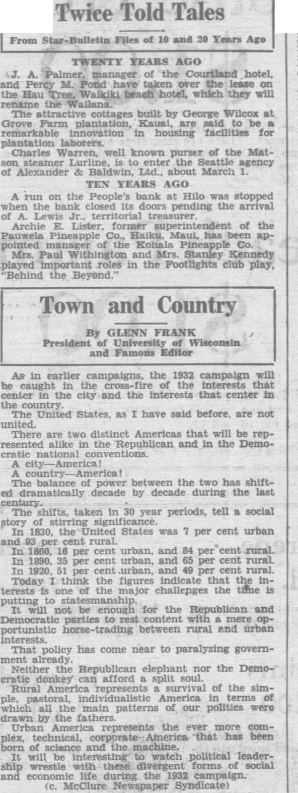 From Files of 10 and 20 Years Ago YEARS AGO manager of the Courtland hotel, and Percy Pond have taken over the the Hau which they will rename The cottages built by George Wilcox Grove Farm plantation, Kauai, said be remarkable innovation in housing facilities for plantation laborers. Charles Warren, well known purser of the Matenter the agency Alexander Baldwin, Ltd., about March YEARS AGO A run on the People's bank at Hilo was stopped when the bank closed its doors pending the arrival Lewis Archie Lister, former of the Pauwela Pineapple Haiku, Maui, has been pointed manager the Kohala Pineapple Mrs. Paul Withington and Mrs. Stanley Kennedy roles in the Footlights club play, 'Behind the Beyond." As in earlier campaigns, the 1932 campaign will be caught in the the interests that in the and the interests that center in The United States, as have said before, are not united. There are two distinct Americas that will be represented alike in the Republican and in the Democratic national The balance of power between the two has shiftdramatically decade by decade during the last The shifts, taken in 30 year periods, tell social story 1830, the United States was per cent urban and per cent rural cent urban, and rural. In 1890, per cent urban, and per cent rural. per and 49 cent rural. Today think figures indicate that interests major challenges the time will not be enough for the Republican and Democratic to with mere portunistic between rural and urban interests. That policy has come near to paralyzing governalready. the Republican elephant nor the Democratic afford split soul America represents survival of the simindividualistic America which all the main patterns of our polities were drawn by fathers Urban America represents the ever more complex, technical, that has been science and the machine. will to watch political leadership wrestle with these divergent forms social and economic life during the 1932 campaign. McClure Newspaper Syndicate)