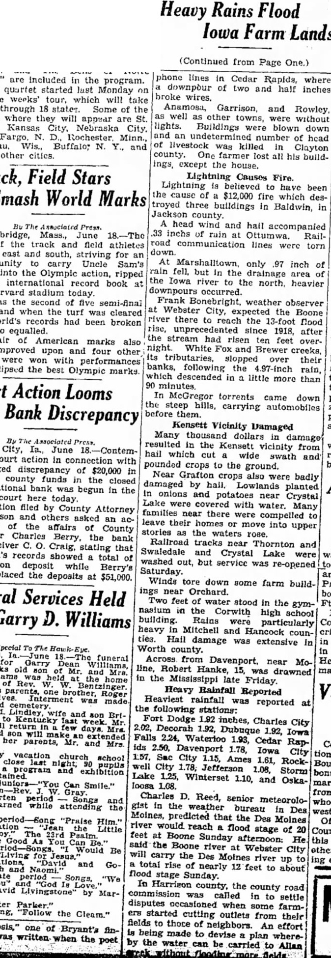 Heavy Rains Iowa Farm Lands phone lines in Cedar Rapids, where downpour of two and half inches broke wires. Anamosa, Garrison, and well other towns, were without lights. Buildings were blown down undetermined number of head livestock killed Clayton county. One farmer lost all his buildings, except the house. Field Stars Lightning Causes Fire Lightning is believed to have been the cause of $12,000 fire which desSmash World Marks troyed three buildings in Baldwin, in county. head wind and hail accompanied Mass., June inchs of rain Ottumwa. Railtrack and field athletes road communication lines were torn down of the cast and south, striving for an carry Uncle Sam's At Marshalltown, only .97 inch shield the Olympic action, ripped fell, but In the drainage at international record book at the Iowa river the north, heavier stadium today. occurred. second of semi-final Frank Bonebright, weather observer Webster meets and when the turf was cleared expected the Boone two world's records had been broken there to reach the 13-foot flood unprecedented since 1918, after pair of American marks also stream had risen ten feet overnight White and Brewer creeks, upon and four other events were with performances slopped over their banks, following the that eclipsed the best Olympic marks. rain, descended in little more than Court Action Looms In McGregor torrents came down steep hills, carrying automobiles In Bank Discrepancy before them. Kensett Vicinity Damaged Many thousand dollars in damage resulted the Kensett vicinity from City, June hail which wide swath and plated court action in connection with pounded crops to the ground. discrepancy of $20,000 Near Grafton crops also were badly county funds the closed damaged by hall planted First National bank was begun in the in onions and potatoes near Crystal court here today. Lake with water. Many petition filed by County Attorney families near there were compelled Olson and others asked an leave their homes or move into upper counting of the affairs County stories the waters rose. Treasurer Berry, the bank Rallroad tracks near Thornton and and Receiver Craig, stating that Swaledale and Crystal Lake were the bank's records showed total of washed out, but service was re-opened deposit while Berry's Saturday. placed the deposits at $51,000. Winds tore down some farm buildings near Orchard. Services Held Two feet of water stood in the gymnasium the Corwith high school building. Rains were particularly heavy Mitchell and Hancock ties. Hall damage extensive In in Worth county. funeral Across from near Moline, Robert Hanke, 15, drawned in the Mississippi late Friday. Heavy Reported Roger Interment was Heaviest rainfall reported the following stations: and Kentucky Fort Dodge inches, Charles City 2.02, Decorah 1.92, Dubuque 1.92, Iowa Falls 2.24, Waterioo her 1.93, Cedar parents, ids Davenport 1.78, Iowa City vacation church school Sac City Ames 1.61, RockCity 1.78; Jefferson Storm bonus Lake 1.25, Winterset 1.10, and OskaCan loosa 1.08. from period Charles D. Reed, senior meteorolowhile attending gist in the bureau Des Moines, predicted that the Des Moines "Praise Of river would reach flood Little stage of feet Boone Sunday this said the Boone river Webster City Be others will carry the Des Moines river to and Gototal rise of nearly 12 feet to about flood stage Sunday. In the county road by Mar- commission was called in to settle Parker." disputes occasioned when some farmthe started cutting outlets from their fields to those of neighbors. An effort one of Bryant's is being made to devise plan wherethe poet the water be can carried Allan