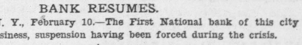 Y., February 10.-The First National bank of this city ... resumes business, suspension having been forced during the crisis. -