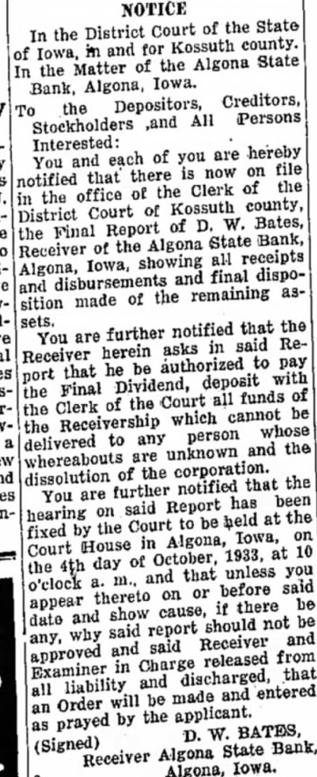 NOTICE In the District Court of the State of Iowa, in and for Kossuth county. In the Matter of the Algona State Bank, Algona, Iowa. To the Depositors, Creditors, Stockholders ,and All Persons Interested: You and each of you are hereby notified that there is now on file in the office of the Clerk of the District Court of Kossuth county, the Final Report of D. W. Bates, Receiver of the Algona State Bank, Algona, Iowa, showing all receipts and disbursements and final disposition made of the remaining assets. You are further notified that the Receiver herein asks in said Rethat he be authorized to pay port the Final Dividend, deposit with the Clerk of the Court all funds of the Receivership which cannot be delivered to any person whose whereabouts are unknown and the dissolution of the corporation. You are further Report notified has that been the fixed hearing by on the said Court to be held at the Court House in Algona, Iowa, on the 4th day of October, 1933, at 10 o'clock a. m., and that unless you appear thereto on or before said be date and show cause, if there any, why said report should not be approved and said Receiver and Examiner in Charge released from all liability and discharged, that an Order will be made and entered as prayed by the applicant. D. W. BATES, (Signed) Receiver Algona State Bank, Algona, Iowa.