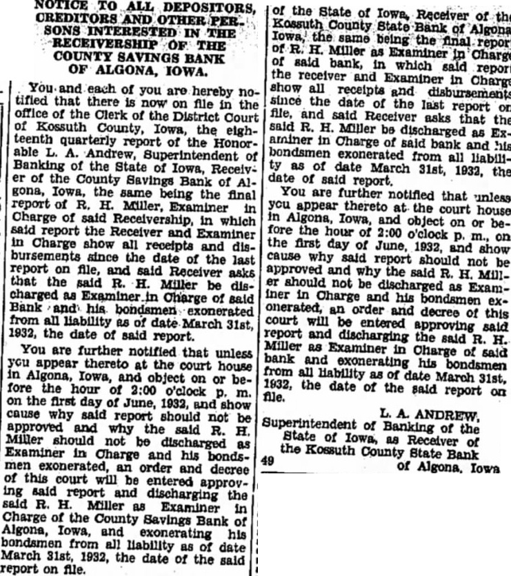 NOTICE OF SHERIFFS SALE STATE OF IOWA, KOSSUTH COUNTY, SS. Notice hereby given that by virtue of Special Execution directfrom Clerk the District Court of Kossuth county, Iowa, judgment rendered in court the 29th day of September, 1933, in favor American Trust Savings Bank, Dubuque, Iowa, plaintiff, and against Anna Bohannon, defendants, for sum of Thirteen Hundred Twelve ($1312.31) Dollars costs, taxed 86/100 ($68.86) Dollars accrucosts, have Ievied upon the folowing described Real property the property said Anna Bohannon, Dore Frech, Lennice Frech, Kossuth county, Iowa, satisfy said execution, two Block Algona, Iowa; will proceed sell property, 30 thereof may be satisfy said with costs public to highest bidder, for cash, in hand, the day 1933, at the door of the Court House Algona, in county, Iowa, at the hour of 10 o'clock m., of said when where due attendance will be given by the undersigned. Dated this day of October, 1933 CARL Sheriff County, Iowa. By Casey Loss, Deputy. L. Winkel, Plaintiff's Attorney. 5-6