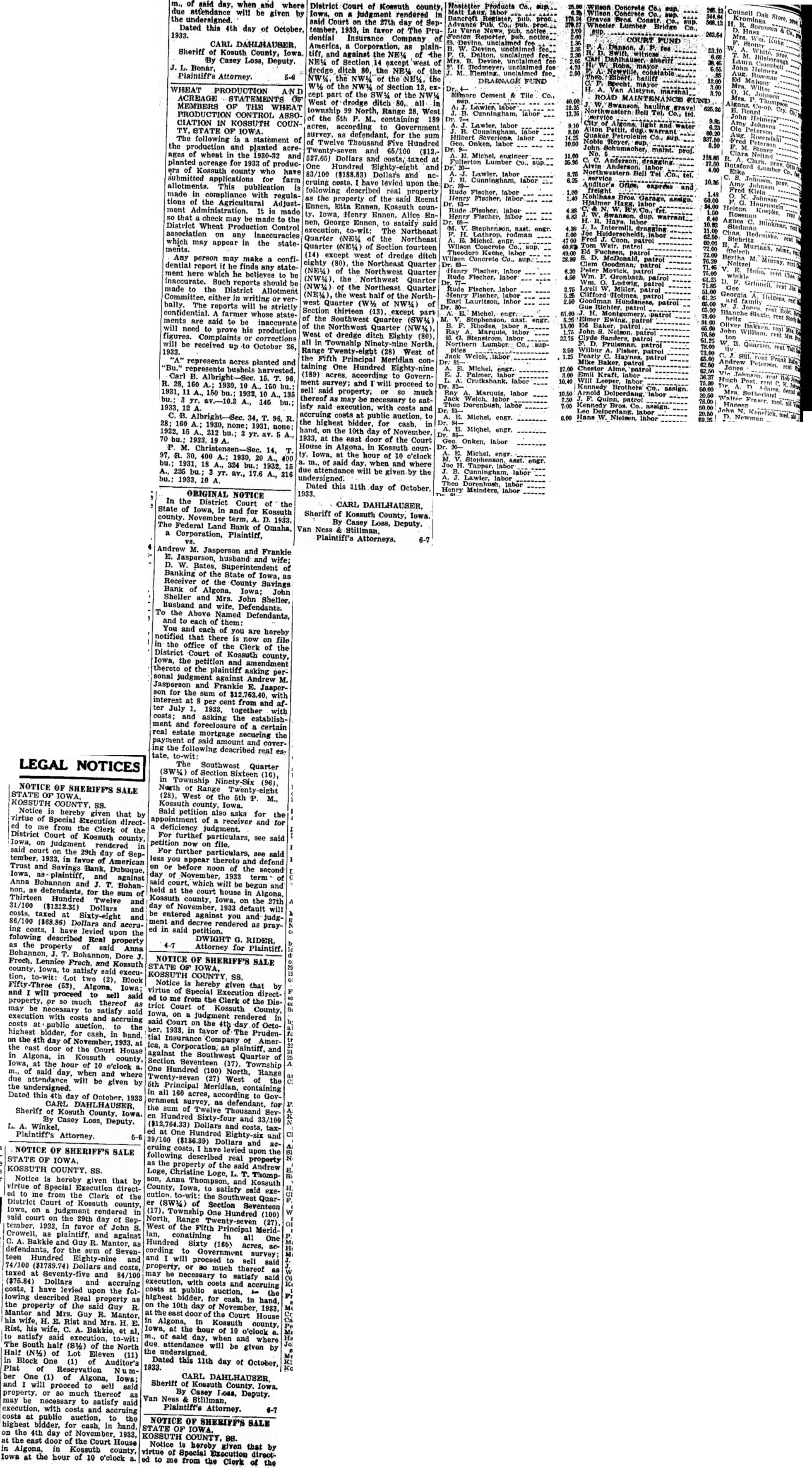 NOTICE OF SHERIFF'S SALE STATE IOWA, COUNTY, SS. Notice hereby given that by virtue of Execution ed from the Clerk the District Court of Kossuth County, Iowa, on in on the 4th day of Octo1933, in favor The Prudential of America, as plaintiff, and against the Quarter Section Township North, Range (27) West 6th Principal Meridian, in all 160 acres, to Government survey, as defendant, for the sum of Twelve SevHundred Sixty-four and 33/100 Dollars costs, taxat One Eighty-six Dollars accruing costs, have levied upon the following described real property the property of the Andrew Loge, Loge, ThompAnna Thompson, and Kossuth County, Iowa, to satisfy said exethe Southwest Quarer Section Seventeen Township One Hundred (100) North, Range West of the Fifth Principal Meridian, conatining One Hundred Sixty (160) acres, according Government survey; proceed sell said property, much thereof may necessary to satisfy execution, with costs accruing costs at public auction, the highest bidder, cash. in hand, on 10th day of November, 1983, door the Court House Algona, Kossuth county, Iowa, at the hour of 10 o'clock said day, when and where due attendance will be given by the undersigned. Dated this 11th day of October, 1933.