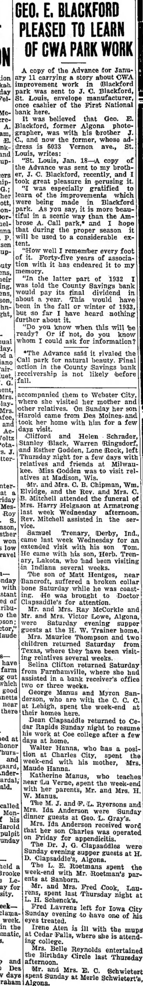 PLEASED copy of the Advance for Janu11 story about CWA park was sent Blackford, Louis, cashier of the First National here. It was believed that Geo. Blackford, former Algona photographer, was with his brother now the former, whose dress 5033 Vernon ave., St. Louis, writes: Louis, Jan. copy the Advance to brothBlackford, recently, and great pleasure in perusing gratified learn of the improvements which being made in Blackford As more beauscenic way than the Ambrose Call park,* hope that during the proper be used to tent. well remember every foot years associawith has endeared it to my the latter part of 1932 told the County Savings bank would its final dividend pay about year. This would have been in the fall or winter of but far have heard nothing about you know when this will be ready? Or not, do know you whom could ask for information? Advance said rivaled the Call park for natural beauty. Final action the County Savings bank receivership not likely before fall. accompanied them to Webster City, where visited her mother other On her Harold came from Des took home with him for few days visit. Clifford and Helen Schrader, Stanley Black, Warren Ringsdorf, Esther Lone Rock, Thursday night for few days relatives and friends at MilwauMiss Godden to visit Indiana several weeks. Dean Clapsaddle returned to Mrs. were Sunday evening supper guests the Lauhis attend-