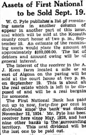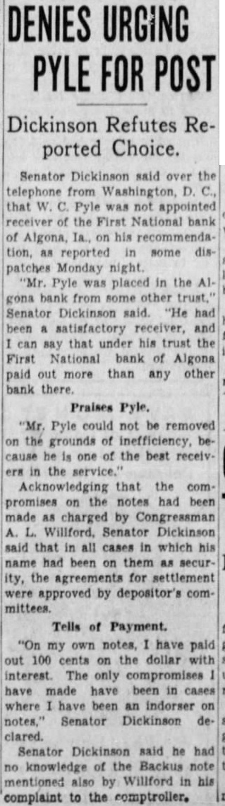 A dispatch from Washington that indicated there that C. Pyle will be retained as receiver of the Commercial National and Pioneer banks of Waterloo, derequest Congressman A. C. that he be replaced. as is understood to be such that the compoffice will make no change Not by Senator L. Dickinson is quoted as saying that Pyle was pointed receiver the First National bank of Algona, Ia., his Dickinson is further quoted as follows: "Mr. Pyle was placed in the Albank from some trust. He had been a and can say that under his First National bank Algona more than any other Pyle could not be removed on the grounds of inefficiency, because he one of the best receivers in the service." Says Compromise Approved. Acknowledging that the compromises on the notes had made stated by Willford. Dickinson said that all cases which his name had been agreements settlement approved by "On my own notes,' he said "I have paid out 100 cents on the dollar, with interest.'
