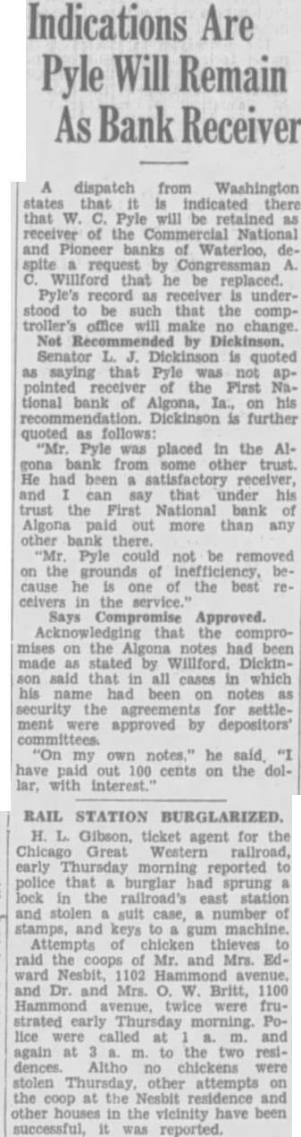 RAIL STATION BURGLARIZED. H. L. Gibson, ticket agent for the Chicago Great Western railroad, early Thursday morning reported to police that burglar had sprung lock in the railroad's east station and stolen suit case, number of stamps, and keys to machine thieves to raid the Mr. and Mrs. Edward 1102 and Dr. and Mrs. O. W. Britt, 1100 avenue, twice were frustrated early Thursday morning. Police called m. and again at to the two residences. Altho no chickens were Thursday attempts on the coop at the Nesbit residence and other in the vicinity have been successful, it was reported.