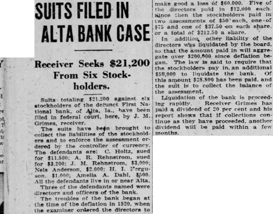 Bank Receiver Reports. Alta, Ia., July 26.-Special: W. M. Grimes, receiver of the First National bank of Alta, has made his quarterly report to the controller of currency. Since his appointment, December, he has collected and disbursed 416 and now has $39,529 on hand. The assets his hands include in $99,751 in other as$2,198 in assets acquired since the established, and $23,196 in unpaid stock total $353,085, against which there are liabilities of $414,319.