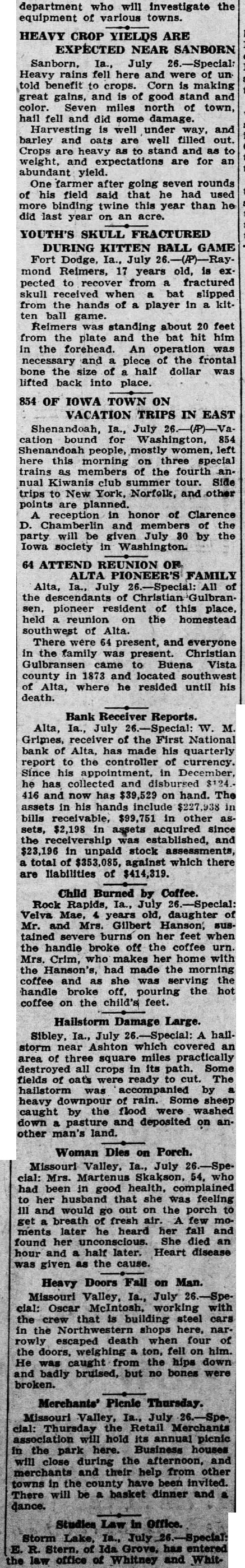 HEAVY CROP YIELDS ARE EXPECTED NEAR SANBORN July Heavy fell here and were of un told benefit to crops. Corn making great gains, and of good stand and color. Seven miles north of town, hall fell and did some damage. Harvesting is well under way, and barley and oats are well filled out. Crops are heavy stand and weight, and expectations are for an abundant yield. One after going seven rounds of his field that he had used binding twine this year than he did last year on an acre.