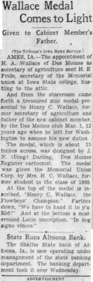 Wallace Medal Comes to Light Given to Cabinet Member's Father. (The Tribune's Iowa News Service AMES, IA.-The appointment of H. A. Wallace of Des Moines as secretary of agriculture sent H. E Pride, secretary of the Memorial union at Iowa State college, husthing to the attic. And from the storeroom came forth treasured zinc medal presented to Henry C. Wallace, for mer secretary of agriculture and father of the new cabinet member by the Des Moines club Mar. 1, 12 years ago when he left for Washington to assume his new duties The medal, which is about 15 inches across, was designed by J. N. (Ding) Darling, Des Moines Register cartoonist The medal was given the Memorial Union Corp. by Mrs. H. C. Wallace, for mer student in the class of 1889 At the top of the medal is inscribed. "Henry C. Wallace, the Plowboys' Champion. Farther down, "We have to hand it to y'u Kid!" And at the bottom modernized Latin inscription, "In hog signo vinces." State Runs Altoona Bank. The Shaffer State bank of Altoona, Ia., is now operating under management of the state banking department. The banking depart ment took it over Wednesday ADVERTISEMENT