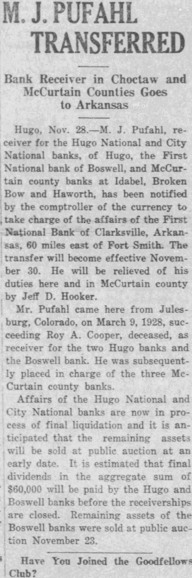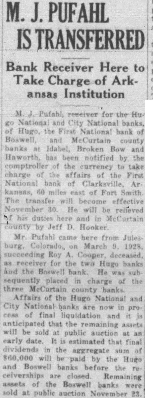 PUFAHL TRANSFERRED Bank Receiver Here to Take Charge of Arkansas Institution receiver for the HuNational and City National banks, Hugo, the First National bank of Boswell, and McCurtain county banks at Idabel, Broken Bow and Haworth, has been notified by the comptroller of the currency to take charge of the affairs of the First National bank of Clarksville, Arkansas, 60 miles east of Fort Smith The transfer will become effective November 30. He will be relieved his duties here and in McCurtain county by Jeff D. Hooker. Mr Pufahl came here from Julesburg, Colorado, on March 1928. succeeding Roy Cooper, deceased. receiver for the two Hugo banks and the Boswell bank. He was subsequently placed in charge of the three McCurtain county banks. Affairs of the Hugo National and City National banks are now in process of final liquidation and anticipated that the remaining assets will be sold at public auction at early date. estimated that final dividends in the aggregate sum of will be paid by the Hugo and Boswell banks before the ceiverships are closed. Remaining assets of the Boswell banks were sold at public auction November 23.