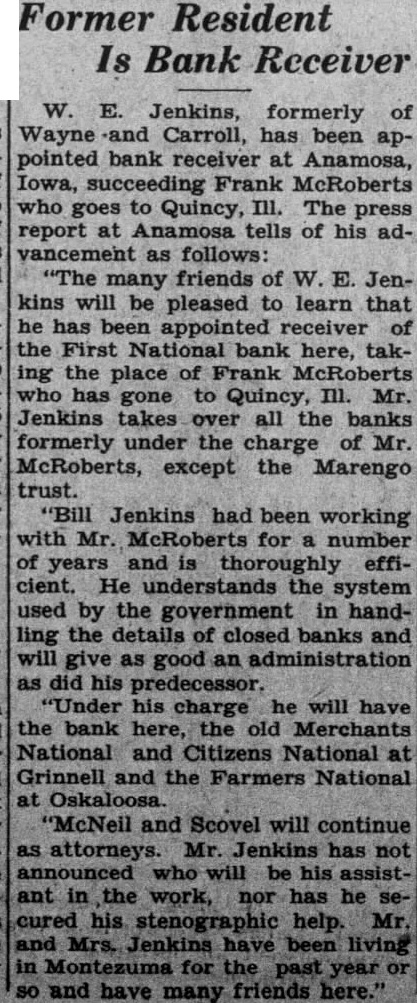 Former Is Receiver Jenkins, formerly Carroll, been pointed bank receiver at Anamosa, succeeding Frank McRoberts to Quincy, The press report Anamosa tells of his as follows many friends of kins will be pleased to learn that he has been appointed receiver First National bank here, the place of Frank McRoberts to Quincy, Mr. Jenkins takes all the banks formerly under the except the Marengo trust. Jenkins had been working McRoberts for number and thoroughly He understands the system used by the government in ling the details closed banks and administration his will the bank here, old Merchants National and Citizens National Grinnell and the Farmers and Scovel will continue attorneys. announced who will be the work, help. have been the