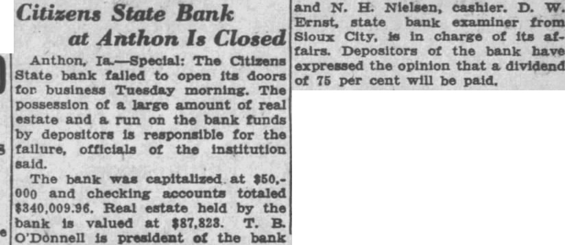 Citizens State Bank at Anthon Is Closed Anthon, Ia.-Special: The Citizens State bank failed to open its doors for business Tuesday morning. The possession of large amount of real estate and a run on the bank funds by depositors is responsible for the failure, officials of the institution said. The bank was capitalized at $50.000 and checking accounts totaled $340,009.96. Real estate held by the bank is valued at $87,823. T. B. O'Donnell is president of the bank collision. and N. H. Nielsen, cashier. D. W. Ernst, state bank examiner from Sloux City, is in charge of its affairs. Depositors of the bank have expressed the opinion that dividend of 75 per cent will be paid.
