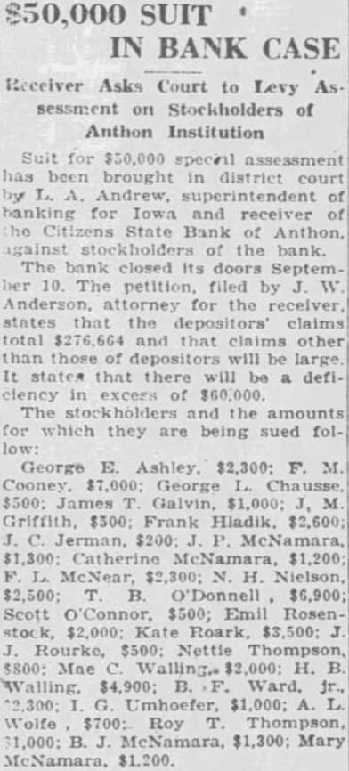 $50,000 SUIT IN BANK CASE Receiver Asks Court to Levy As sessment on Stockholders of Anthon Institution Suit for $50,000 special assessment has been brought in district court by L. A. Andrew, superintendent of banking for Iowa and receiver of he Citizens State Bank of Anthon, against stockholders of the bank. The bank closed its doors Septem ber 10. The petition. filed by W Anderson, attorney for the receiver, states that the depositors' claims total $276,664 and that claims other than those of depositors will be large It states that there will be a deficlency in excess of $60,000 The and the amounts for which they are being sued folGeorge E. Ashley, $2,300: F. M. $500: James T Galvin, $1,000; J, M J. Jerman, $200 P. McNamara, McNear, $2,300; N. H. Nielson, $2,500; T. B. O'Donnell $6,900; Scott 'Connor, $500; Emil RosenJ. Rourke, $500: Nettie Thompson, $800: Mae Walling. $2,000: H. B. G. Umhoefer, $1,000; A. L. Wolfe $700: Roy T. Thompson, $1,000: B. J. McNamara, $1,300; Mary