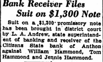 Bank Receiver Files Suit on Suit on note has been brought in district court Andrew, superintendent of banking and receiver of Citizens State bank Anthon against William Hammond, Tom Hammond and Jennie Hammond.