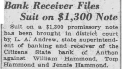 Bank Receiver Files Suit on $1,300 Suit $1,300 note been brought district court Andrew, of banking of the Citizens State bank of Anthon against Tom Hammond and Jennie Hammond.