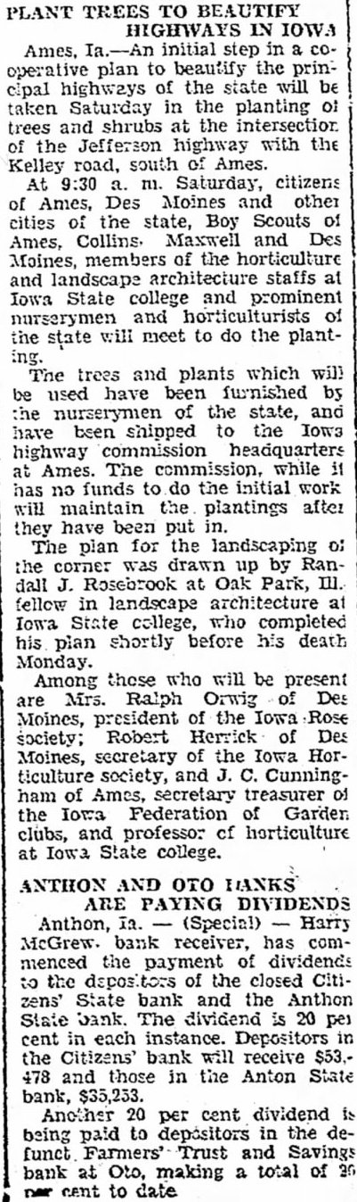 PLANT TREES BEAUTIFY HIGHWAYS IN Ames, plan to beautify the cipal highways of the state be taken Saturday in the planting trees and shrubs at the intersection the Jefferson highway with the Kelley road, south of Ames. At Saturday, citizens Ames, Des Moines and other cities of the state, Boy Scouts Collins. Maxwell and Des Ames, Moines, members of the horticulture architecture staffs at Iowa State college and and the state will meet to do the plantThe trees and plants which will used have been furnished by the nurserymen of the state, and have been shipped to the highway commission headquarters Ames. The commission, while has funds to do the initial work no will the plantings after they have been put The plan for the landscaping 0; the corner was drawn by Randall Rosebrook at Oak Park, fellow in landscape architecture Iowa State college, who completed his plan shortly before his death Monday. Among those who will be present are Mrs. Ralph Orwig of Des Moines, president the Iowa Rose society; Robert Herrick of Des Moines, secretary of the Iowa Horticulture society, and Cunningham of Ames, secretary treasurer Iowa Federation Garden clubs, and professor cf horticulture at Iowa State college. ANTHON AND HANKS ARE PAYING DIVIDENDS Anthon, McGrew. bank receiver, has commenced the payment of dividends the of the closed CitiState bank and the Anthon State bank. The dividend 20 per cent each Citizens' bank will receive 478 and those the Anton State bank, $35,233. Another 20 per cent dividend to depositors in the debeing funct Farmers' Trust and Savings bank at making total cent to date