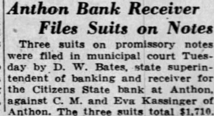 Anthon Bank Receiver Files Suits on Notes Three suits on promissory notes were filed in municipal court Tuesday by D. W. Bates, state superintendent of banking and receiver for the Citizens State bank Anthon. against C. M. and Eva Kassinger of Anthon. The three suits total $1,710.