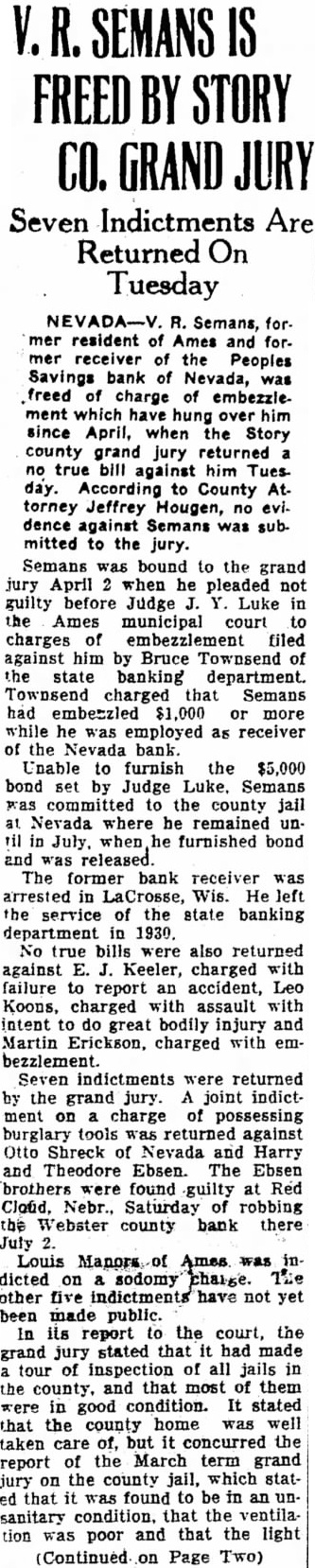SEMANS BY STORY GRAND Seven Indictments Are Returned On Tuesday Semans, for. resident of Ames and forreceiver of the Peoples Savings bank of Nevada, freed charge of embezzlewhich hung over since April, when the Story county grand jury returned no true bill against him Tues. day. According to County At. torney Jeffrey Hougen, no evi. dence against Semans was sub. mitted the jury. Semans was bound to the grand jury April when he pleaded not guilty before Judge Luke in the Ames municipal court charges of embezzlement filed against him by Bruce Townsend of the state banking department. Townsend charged that Semans had embetzled $1,000 or more while he was employed as receiver the Nevada bank. Unable to furnish the $5,000 bond set by Judge Luke. Semans was committed to the county jail Nevada where he remained unJuly. when furnished bond and was released. The former bank receiver arrested in LaCrosse, Wis. He left the service of the state banking department in 1930. No true bills were also returned against Keeler, charged with failure to report an accident, Koons, charged with assault with intent to do great bodily injury and Martin Erickson, charged with embezzlement. Seven indictments were returned the grand jury. joint indictment on charge possessing burglary tools was returned against Otto Shreck of Nevada and Harry and Theodore Ebsen. The Ebsen brothers were found guilty Red Cloud. Nebr., Saturday robbing the Webster county bank there July Louis Ames dicted on sodomy charge. The other five indictments have not yet been made public. In its report to the court, the grand jury stated that had made tour of inspection of all jails the county. and that most of them in good condition. It stated that the county home well taken care of, but concurred the report of the March term grand jury on the county jail, which statthat found to be in sanitary condition. that the ventilation was poor and that the light (Continued on Page Two)