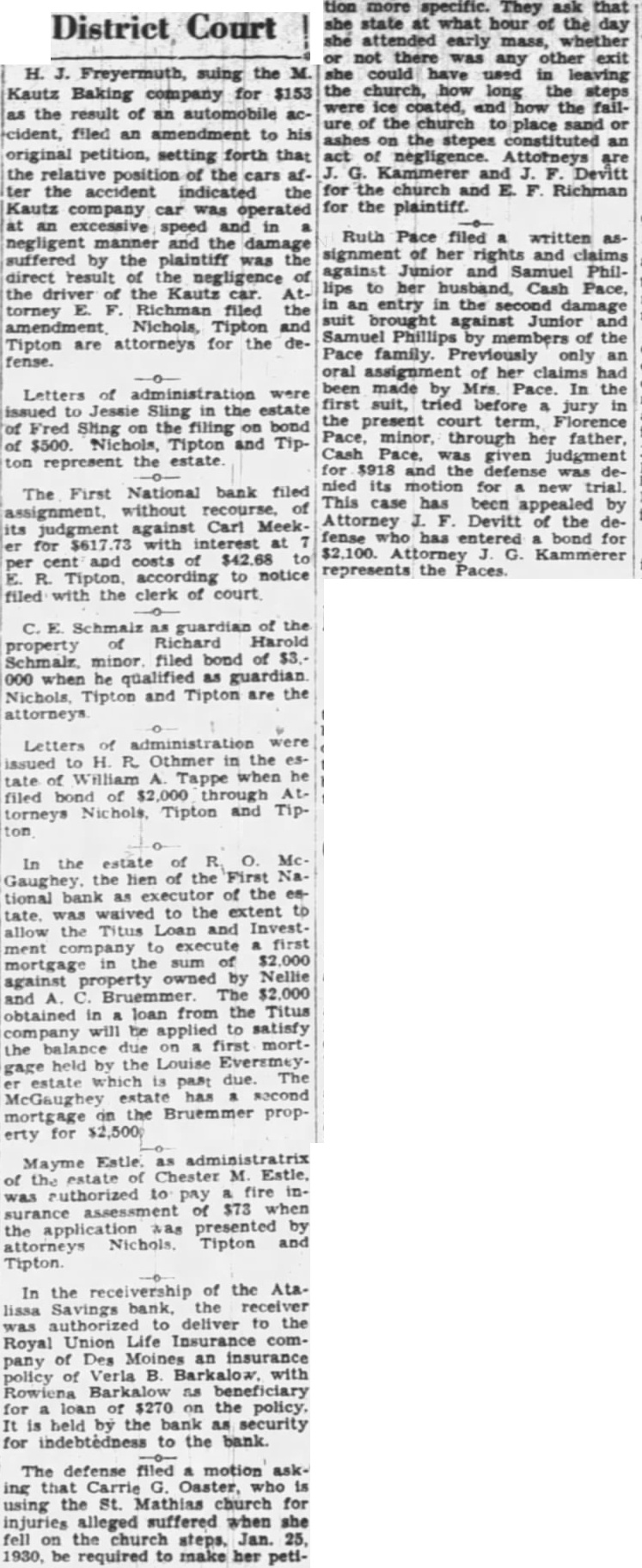 H. J. Freyermuth, suing the M. Kautz Baking company for $153 as the result of an automobile accident, filed an amendment to his original petition, setting forth that the relative position of the cars after the accident indicated the Kautz company car was operated at an excessive speed and in a negligent manner and the damage suffered by the plaintiff was the direct result of the negligence of the driver of the Kautz car. Attorney E. F. Richman filed the amendment. Nichols, Tipton and Tipton are attorneys for the defense.
