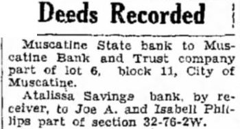 Muscatine State bank to Muscatine Bank and Trust company part lot block 11, City Muscatine. Atalissa Savings bank reby ceiver, to Joe and part of section