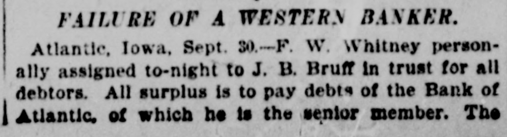 FAILURE OF A WESTERN BANKER. Atlantic, Iowa, Sept. 30.-F. W. Whitney personally assigned to-night to J. B. Bruff in trust for all debtors. All surplus is to pay debts of the Bank of Atlantic. of which he is the senior member. The
