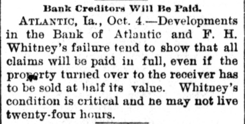 Bank Creditors Will Be Paid. ATLANTIC, Ia., Oct. 4.-Developments in the Bank of Atlantic and F. H. Whitney's failure tend to show that all claims will be paid in full, even if the property turned over to the receiver has to be sold at half its value. Whitney's condition is critical and he may not live twenty-four hours.
