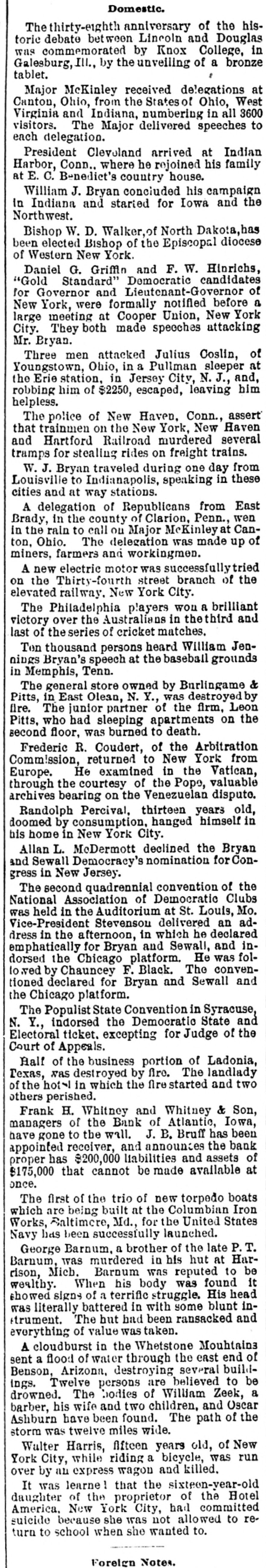 Domestic. The thirty-eighth anniversary of the historie debate between Lincoln and Douglas was commemorated by Knox College, in Galesburg, III., by the unveiling of a bronze tablet. Major McKinley received delegations at Canton, Ohio, from the States of Ohio, West Virginia and Indiana, numbering in all 3600 visitors. The Major delivered speeches to each delegation. President Cleveland arrived at Indian Harbor, Conn.. where he rejoined his family at E. C. Benedict's country house. William J. Bryan concluded his campaign in Indiana and started for Iowa and the Northwest. Bishop W. D. Walker of North Dakota, has been elected Bishop of the Episcopal diocese of Western New York. Daniel G. Griffin and F. W. Hinrichs, "Gold Standard" Democratic candidates for Governor and Lieutcnant-Governor of New York, were formally notified before a large meeting at Cooper Union, New York City. They both made speeches attacking Mr. Bryan. Three men attacked Julius Coslin, of Youngstown, Ohio, in a Pullman sleeper at the Erie station, in Jersey City, N.J., and, robbing him of $2250, escaped, leaving him helpless. The police of New Haven. Conn., assert that trainmen on the New York, New Haven and Hartford Railroad murdered several tramps for stealing rides on freight trains. W. J. Bryan traveled during one day from Louisville to Indianapolis, speaking in these cities and at way stations. A delegation of Republicans from East Brady, in the county of Clarion, Penn., wen in the rain to call on Major McKinley at Canton, Ohio. The delegation was made up of miners, farmers and workingmen. A new electric motor was successfully tried on the Thirty-fourth street branch of the elevated railway. New York City. The Philadelphia players won a brilliant victory over the Australians in thethird and last of the series of cricket matches. Ten thousand persons heard William Jennings Bryan's speech at the baseball grounds in Memphis, Tenn. The general store owned by Burlingame & Pitts, in East Olean, N. Y., was destroyed by fire. The junior partner of the firm, Leon Pitts, who had sleeping apartments on the second floor, was burned to death. Frederic R. Coudert, of the Arbitration Commission, returned to New York from Europe. He examined in the Vatican, through the courtesy of the Pope, valuable archives bearing on the Venezuelan dispute. Randolph Percival, thirteen years old, doomed by consumption, hanged himself in his home in New York City. Allan L. McDermott declined the Bryan and Sewall Democracy's nomination for Congress in New Jersey. The second quadrennial convention of the National Association of Democratic Clubs was held in the Auditorium at St. Louis, Mo. Vice-President Stevensou delivered an address in the afternoon, in which he declared emphatically for Bryan and Sewall, and indorsed the Chicago platform. He was folto .ved by Chauncey F. Black. The conventioned declared for Bryan and Sewall and the Chicago platform. The Populist State Convention in Syracuse, N. Y., indorsed the Democratic State and Electoral ticket. excepting for Judge of the Court of Appeals. Half of the business portion of Ladonia, Texas, was destroyed by fire. The landlady of the hot in which the fire started and two others perished. Frank H. Whitney and Whitney & Son, managers of the Bank of Atlantic, Iowa, have gone to the wall. J. B. Bruff has been appointed receiver, and annountes the bank proper has $200,000 liabilities and assets of $175,000 that cannot be made available at once. The first of the trio of new torpedo boats which are being built at the Columbian Iron Works, Baltimere, Md., for the United States Navy has been successfully launched. George Barnum, a brother of the late P. T. Barnum, was murdered in his hut at Harrison, Mich. Barnum was reputed to be wealthy. When his body was found it showed signs of a terrific struggle. His head was literally battered in with some blunt instrument. The but had been ransacked and everything of value was taken. A cloudburst in the Whetstone Mouhtains sent a flood of water through the east end of Benson, Arizona, destroying several buildings. Twelve persons are believed to be drowned. The bodies of William Zeek, a barber, his wife and two children, and Oscar Ashburn have been found. The path of the storm was twelve miles wide. Walter Harris, flfteen years old, of New York City, while riding a bicycle, was run over by an express wagon and killed. It was learnel that the sixteen-year-old daughter of the proprietor of the Hotel America. New York City, had committed suicide because she was not allowed to return to school when she wanted to. Foreign Notes.