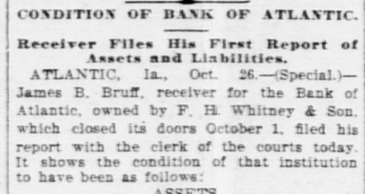 CONDITION OF BANK OF ATLANTIC. Receiver Files His First Report of Assets and Liabilities. ATLANTIC, Ia., Oct. 26.-(Special.)James B. Bruff, receiver for the Bank of Atlantic, owned by F. H. Whitney & Son, which closed its doors October 1, filed his report with the clerk of the courts today. It shows the condition of that institution to have been as follows: ASSETS