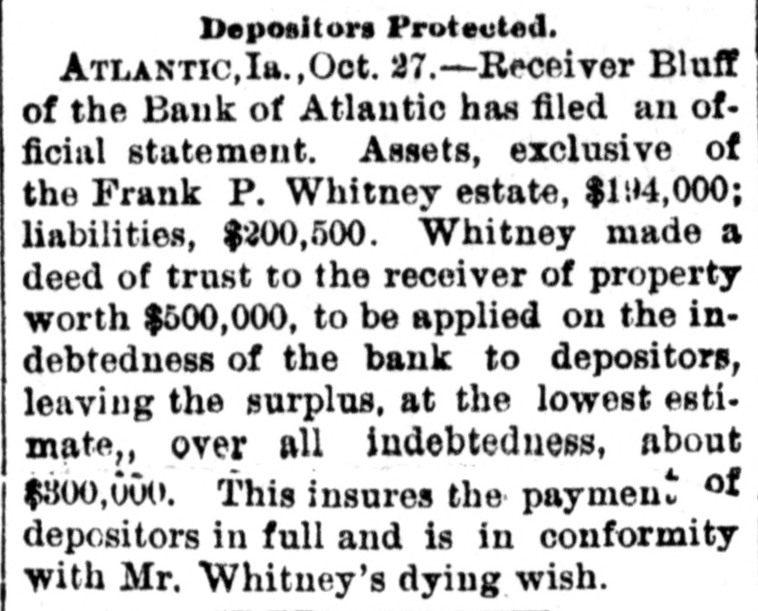 Depositors Protected. ATLANTIC, Ia., Oct. 27.-Receiver Bluff of the Bank of Atlantic has filed an official statement. Assets, exclusive of the Frank P. Whitney estate, $194,000; liabilities, $200,500. Whitney made a deed of trust to the receiver of property worth $500,000, to be applied on the indebtedness of the bank to depositors, leaving the surplus, at the lowest estimate,, over all indebtedness, about $300,000. This insures the payment of depositors in full and is in conformity with Mr. Whitney's dying wish.