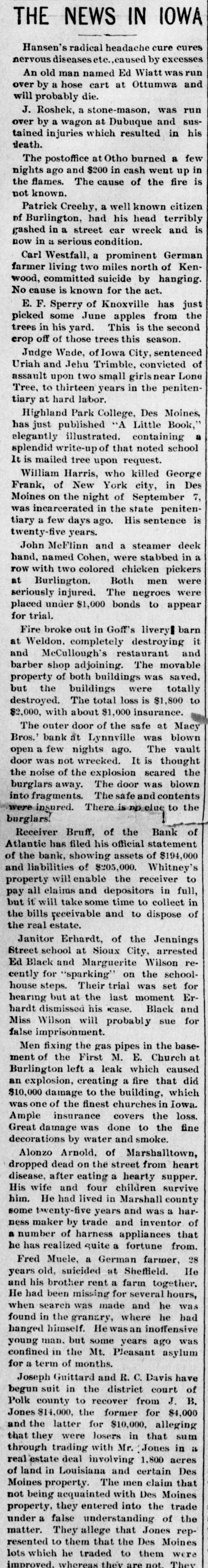 THE NEWS IN IOWA Hansen's radical headache cure cures nervous diseases etc., caused by excesses An old man named Ed Wiatt was run over by a hose cart at Ottumwa and will probably die. J. Roshek, a stone-mason, was run over by a wagon at Dubuque and sustained injuries which resulted in his death. The postoffice at Otho burned a few nights ago and $200 in cash went up in the flames. The cause of the fire is not known. Patrick Creehy, a well known citizen of Burlington, had his head terribly gashed in a street car wreck and is now in a serious condition. Carl Westfall, a prominent German farmer living two miles north of Kenwood, committed suicide by hanging. No cause is known for the act. E. F. Sperry of Knoxville has just picked some June apples from the trees in his yard. This is the second erop off of those trees this season. Judge Wade, of Iowa City, sentenced Uriah and Jehu Trimble, convicted of assault upon two small girls near Lone Tree, to thirteen years in the penitentiary at hard labor. Highland Park College, Des Moines, has just published "A Little Book," elegantly illustrated. containing a splendid write-up of that noted school It is mailed tree upon request. William Harris, who killed George Frank, of New York city, in Des Moines on the night of September 7, was incarcerated in the state penitentiary a few days ago. His sentence is twenty-five years. John McFlinn and a steamer deck hand, named Cohen, were stabbed in a row with two colored chicken pickers at Burlington. Both men were seriously injured. The negroes were placed under $1,000 bonds to appear for trial. Fire broke out in Goff's livery] barn at Weldon. completely destroying it and McCullough's restaurant and barber shop adjoining. The movable property of both buildings was saved, but the buildings were totally destroyed. The total loss is $1,800 to $2,000, with about $1,000 insurance. The outer door of the safe at Macy Bros.' bank at Lynnville was blown open a few nights ago. The vault door was not wrecked. It is thought the noise of the explosion scared the burglars away. The door was blown into fragments. The safe and contents were insured. There is clue to the burglars. Receiver Bruff, of the Bank of Atlantic has filed his official statement of the bank, showing assets of $194,000 and liabilities of $205,000. Whitney's property will enable the receiver to pay all claims and depositors in full, but it will take some time to collect in the bills receivable and to dispose of the real estate. Janitor Erhardt, of the Jennings Street school at Sioux City, arrested Ed Black and Marguerite Wilson recently for "sparking" on the schoolhouse steps. Their trial was set for hearing but at the last moment Erhardt dismissed his case. Black and Miss Wilson will probably sue for false imprisonment. Men fixing the gas pipes in the basement of the First M. E. Church at Burlington left a leak which caused an explosion, creating a fire that did $10,000 damage to the building, which was one of the finest churches in Iowa. Ample insurance covers the loss. Great damage was done to the fine decorations by water and smoke. Alonzo Arnold. of Marshalltown, dropped dead on the street from heart disease, after eating a hearty supper. His wife and four children survive him. He had lived in Marshall county some twenty-five years and was a harness maker by trade and inventor of a number of harness appliances that he has realized quite a fortune from. Fred Muele, a German farmer, 28 years old, suicided at Sheffield. He and his brother rent a farm together. He. had missing hours