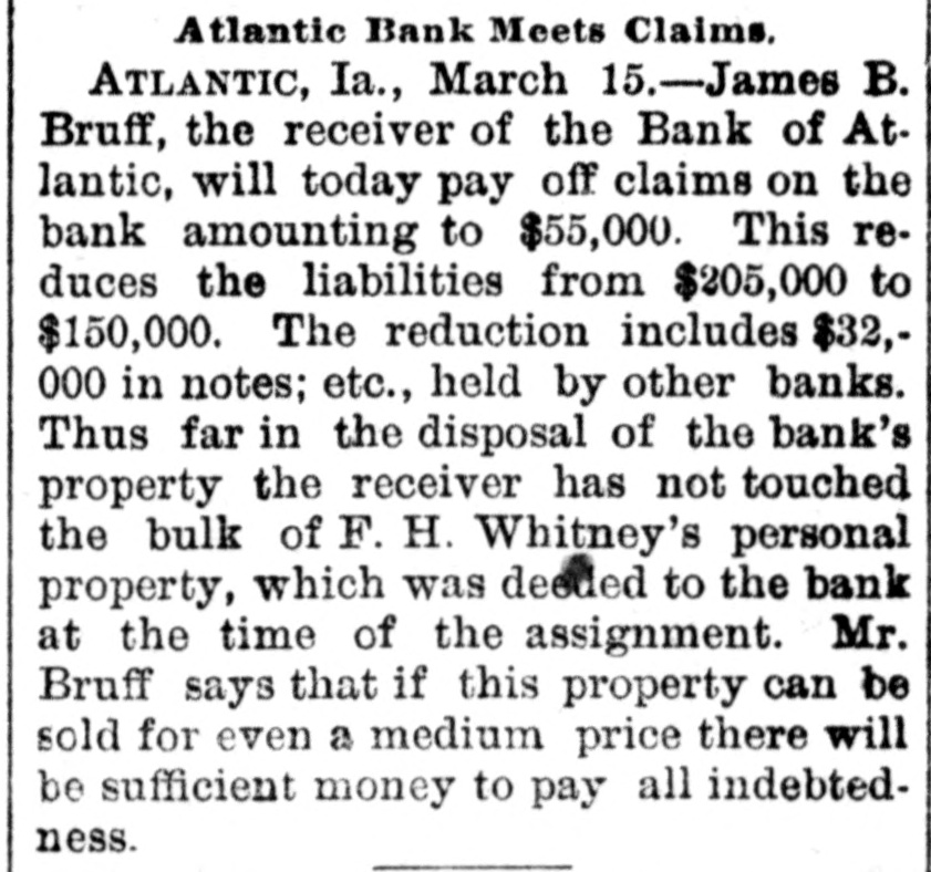 Atlantic Bank Meets Claims. ATLANTIC, Ia., March 15.-James B. Bruff, the receiver of the Bank of Atlantic, will today pay off claims on the bank amounting to $55,000. This reduces the liabilities from $205,000 to $150,000. The reduction includes $32,000 in notes; etc., held by other banks. Thus far in the disposal of the bank's property the receiver has not touched the bulk of F. H. Whitney's personal property, which was deeded to the bank at the time of the assignment. Mr. Bruff says that if this property can be sold for even a medium price there will be sufficient money to pay all indebtedness.