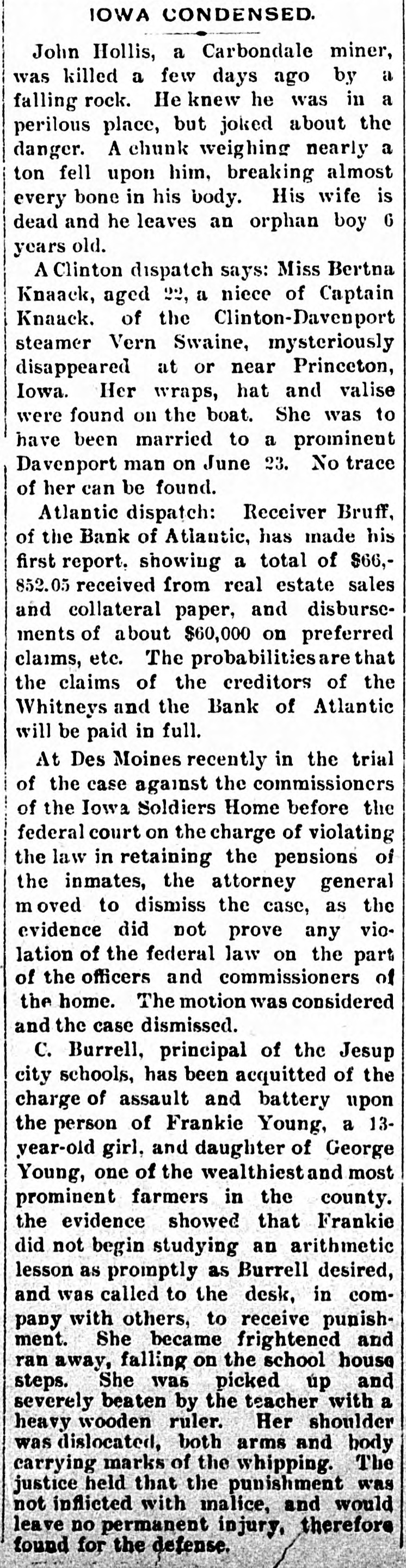 IOWA CONDENSED. John Hollis, a Carbondale miner, was killed a few days ago by a falling rock. He knew he was in a perilous place, but joked about the danger. A chunk weighing nearly a ton fell upon him, breaking almost every bone in his body. His wife is dead and he leaves an orphan boy 6 years old. A Clinton dispatch says: Miss Bertna Knaack, aged 22, a niece of Captain Knaack, of the Clinton-Davenport steamer Vern Swaine, mysteriously disappeared at or near Princeton, Iowa. Her wraps, hat and valise were found on the boat. She was to have been married to a prominent Davenport man on June 23. No trace of her can be found. Atlantic dispatch: Receiver Bruff, of the Bank of Atlantic, has made his first report, showing a total of $66,852.05 received from real estate sales and collateral paper, and disbursements of about $60,000 on preferred claims, etc. The probabilities are that the claims of the creditors of the Whitneys and the Bank of Atlantic will be paid in full. At Des Moines recently in the trial of the case against the commissioners of the Iowa Soldiers Home before the federal court on the charge of violating the law in retaining the pensions of the inmates, the attorney general moved to dismiss the case, as the evidence did not prove any violation of the federal law on the part of the officers and commissioners of the home. The motion was considered and the case dismissed. C. Burrell, principal of the Jesup city schools, has been acquitted of the charge of assault and battery upon the person of Frankie Young, a 13-year-old girl, and daughter of George Young, one of the wealthiest and most prominent farmers in the county. the evidence showed that Frankie did not begin studying an arithmetic lesson as promptly as Burrell desired, and was called to the desk, in company with others, to receive punishment. She became frightened and ran away, falling on the school house steps. She was picked up and severely beaten by the teacher with a heavy wooden ruler. Her shoulder was dislocated, both arms and body carrying marks of the whipping. The justice held that the punishment was not inflicted with malice, and would leave no permanent injury, therefore found for the defense.