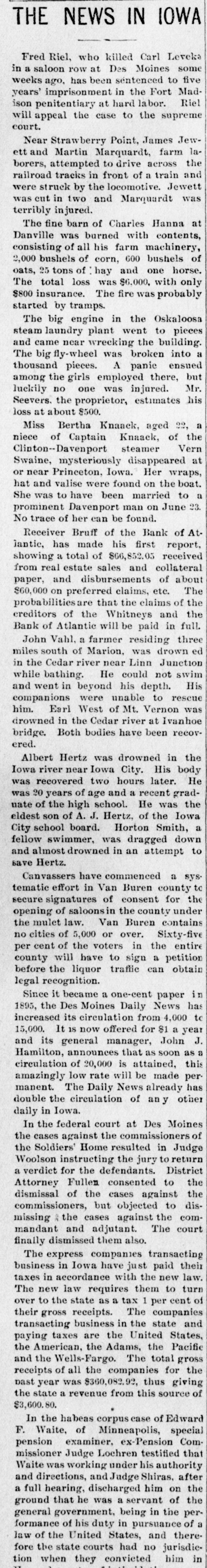 THE NEWS IN IOWA Fred Riel, who killed Carl Leveka in a saloon row at Des Moines some weeks ago, has been sentenced to five years' imprisonment in the Fort Madison penitentiary at hard labor. Riel will appeal the case to the supreme court. Near Strawberry Point, James Jewett and Martin Marquardt, farm laborers, attempted to drive across the railroad tracks in front of a train and were struck by the locomotive. Jewett was cut in two and Marquardt was terribly injured. The fine barn of Charles Hanna at Danville was burned with contents, consisting of all his farm machinery, 2,000 bushels of corn, 600 bushels of oats, 25 tons of : hay and one horse. The total loss was $6,000, with only $800 insurance. The fire was probably started by tramps. The big engine in the Oskaloosa steam laundry plant went to pieces and came near wrecking the building. The big fly-wheel was broken into a thousand pieces. A panie ensued among the girls employed there, but luckily no one was injured. Mr. Seevers. the proprietor, estimates his loss at about $500. Miss Bertha Knaack, aged 22, a niece of Captain Knaack, of the Clinton--Davenport steamer Vern Swaine, mysteriously disappeared at or near Princeton, Iowa. Her wraps, hat and valise were found on the boat. She was to have been married to a prominent Davenport man on June 23. No trace of her can be found. Receiver Bruff of the Bank of Atlantic, has made his first report, showing a total of $66,852.05 received from real estate sales and collateral paper, and disbursements of about $60,000 on preferred claims, etc. The probabilitiesar that the claims of the creditors of the Whitneys and the Bank of Atlantic will be paid in full. John Vahl, a farmer residing three miles south of Marion, was drown ed in the Cedar river near Linn Junction while bathing. He could not swim and went in beyond his depth. His companions were unable to rescue him. Earl West of Mt. Vernon was drowned in the Cedar river at Ivanhoe bridge. Both bodies have been recovered. Albert Hertz was drowned in the Iowa river near Iowa City. His body was recovered two hours later. He was 20 years of age and a recent gradnate of the high school. He was the eldest son of A. J. Hertz, of the Iowa City school board. Horton Smith, a fellow swimmer, was dragged down and almost drowned in an attempt to save Hertz. Canvassers have commenced a sys. tematic effort in Van Buren county to secure signatures of consent for the opening of saloonsin the county under the mulet law. Van Buren contains no cities of 5,000 or over. Sixty-five per cent of the voters in the entire county will have to sign a petition before the liquor traffic can obtain legal recognition. Since it became a one-cent paper in 1895, the Des Moines Daily News has increased its circulation from 4,000 tc 15,000. It is now offered for $1 a year and its general manager, John J. Hamilton, announces that as soon as a circulation of 20,000 is attained, this amazingly low rate will be made permanent. The Daily News already has double the circulation of an y other daily in Iowa. In the federal court at Des Moines the cases against the commissioners of the Soldiers' Home resulted in Judge Woolson instructing the jury to return a verdict for the defendants. District Attorney Fullen consented to the dismissal of the cases against the