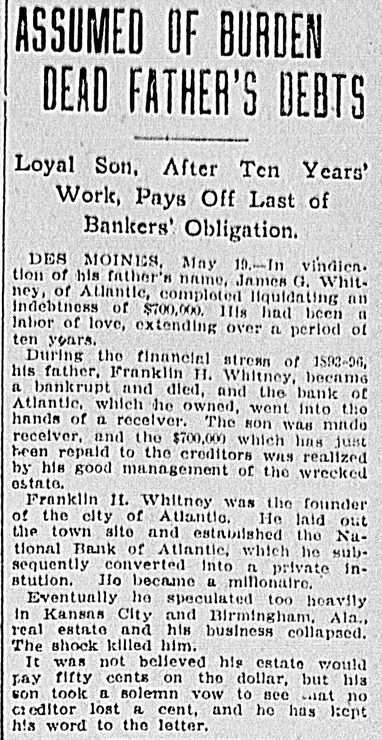 ASSUMED OF BURDEN DEAD FATHER'S DEBTS Loyal Son. After Ten Years' Work, Pays Off Last of Bankers' Obligation. DES MOINES, May 10.1m vindien. tion of his father's name, James G. Whitney, of Atlantic, completed liquidating an Indebtness of $700,000. 111s had been a Inbor of love, extending over a period of ten years. During the financial stream of 1593-96, his father, Franklin H. Whitney, became a bankrupt and died, and the bank of Atlantic, which he owned, went into the hands of a receiver. The son was mado receiver, and the $700,000 which has just been repaid to the creditors was realized by his good management of the wrecked estate. Franklin 11. Whitney was the founder of the city of Atlantic. He laid out the town sito and established the National Bank of Atlantic, which he subsequently converted into a private instution. Ho became a millonaire. Eventually he speculated too heavily in Kansas City and Birmingham, Ala., real estate and his business collapsed. The shock killed him. It was not believed his estate would pay fifty cents on the dollar, but his son took a solemn vow to see mat no creditor lost a cent, and he has kept his word to the letter.