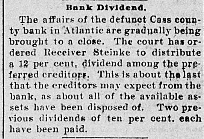 Bank Dividend. The a ffairs of the defunct Cass county bank in Atlantic are gradually being brought to a close. The court has ordered Receiver Steinke to distribute a 12 per cent, dividend among the preferred creditors. This is about the last that the creditors may expect from the bank, as about all of the available assets have been disposed of. Two previous dividends of ten per cent. each have been paid.