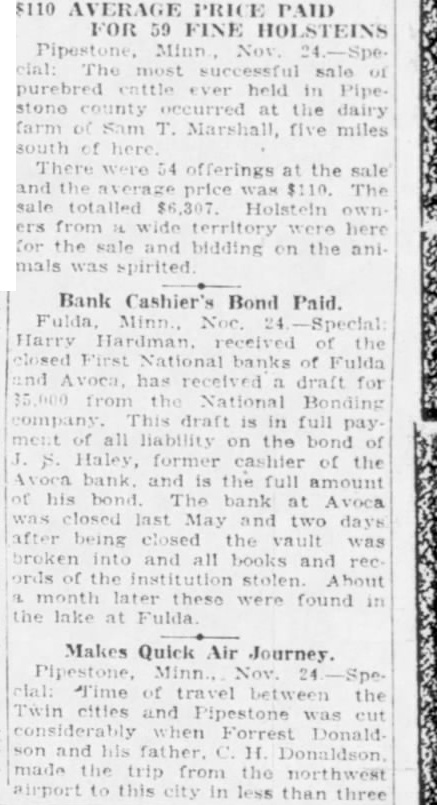 $110 AVERAGE PRICE PAID FOR 59 FINE HOLSTEINS Pipestone, Minn Nov. most successful sale purebred held in Pipestone at the dairy farm of Sam T Marshall, five miles south of There were offerings the sale and the The sale totalled Holstein ers from here for the sale and bidding on the animals was spirited Bank Cashier's Bond Paid. Harry Hardman received of the First National banks of Fulda Avoca, has received a draft for from the National Bonding This draft is in full pay all liability on the bond of Haley, former cashier of the Avoca bank, and is the full amount or his bond The bank at Avoca closed last May and two days after being closed the vault was broken into and all books and rec of the institution stolen. About month later these were found in the lake at Fulda Makes Quick Air Journey. Time of travel between the Twin cities and Pipestone was cut when Forrest Donald son and his father H. Donaldson made the trip from the northwest airport to this city in less than three