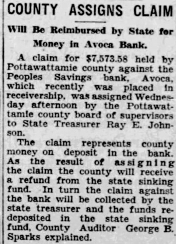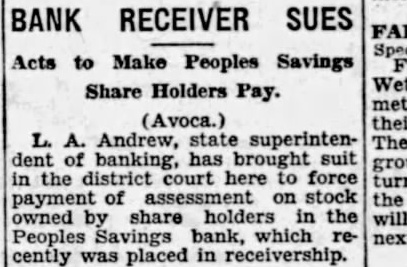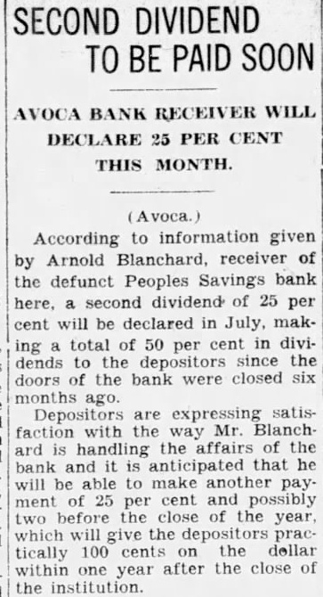 Avoca, With some assets the defunct Peoples Savings bank here being rapidly liquidated and a first dividend per cent having been by charge. Arnold Blanchard, is now believed by the examiner that be able pay depositors nearly 90 cent of co-operation of the other here, the Citizens Savings bank and the Avoca State bank, liquidate about during the first four months of the receivership