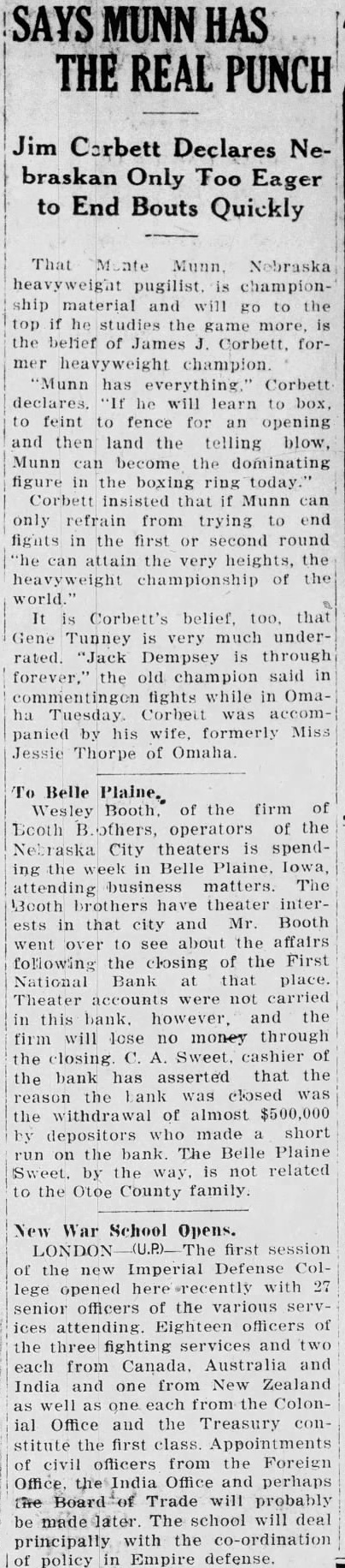 SAYS MUNN HAS THE REAL PUNCH Jim Corbett Declares Nebraskan Only Too Eager to End Bouts Quickly heavyweight pugilist is championship material and will go to the top if he studies the game more is the belief of James J. Corbett. former heavyweight champion Munn has everything.' Corbett declares. "If he will learn to box, to feint to fence for an opening and then land the telling blow, Munn can become the dominating figure in the boxing ring today. Corbett insisted that if Munn can only refrain from trying to end fights in the first or second round "he can attain the very heights, the heavyweight championship of the world It is Corbett's belief, too, that Gene Tunney is very much underrated. "Jack Dempsey is through forever, the old champion said in commentingon fights while in Omaha Tuesday Corbett was accom panied by his wife, formerly Miss Jessie Thorpe of Omaha. To Belle Plaine. Wesley Booth. of the firm of Bcoth B.others, operators of the Nebraska City theaters is spending the week in Belle Plaine, Iowa, attending business matters. The Booth brothers have theater interests in that city and Mr. Booth went over to see about the affairs following the closing of the First National Bank at that place. Theater accounts were not carried in this bank. however, and the firm will lose no money through the closing C. A. Sweet. cashier of the bank has asserted that the reason the bank was closed was the withdrawal of almost $500,000 by depositors who made a short run on the bank. The Belle Plaine Sweet. by the way, is not related to the Otoe County family. New War School Opens. LONDON The first session of the new Imperial Defense College opened here -recently with 27 senior officers of the various services attending. Eighteen officers of the three fighting services and two each from Canada. Australia and India and one from New Zealand as well as one each from the Colonial Office and the Treasury constitute the first class Appointments of civil officers from the Foreign Office the India Office and perhaps the Board Trade will probably be made later. The school will deal principally with the co-ordination of policy in Empire defense.