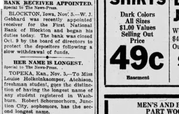 BANK RECEIVER APPOINTED. BLOCKTON, Iowa, Nov: Dark Colors Gebhard was recently appointed All Sizes receiver for the First National $1.00 Values Bank of Blockton and began his Selling Out duties today. The bank closed Oct. by the board of directors to Price protect the depositors following withdrawal of funds. HER NAME IS LONGEST. TOPEKA, Kan., Nov. Miss Basement Louise Holkolnkaomper, Atchison, freshman student, goes the distinetion of having the name of any student registered in Washburn. Robert Schormorhorn, Junction City, sophomore, has the second longest name. PART WOOL