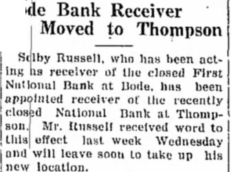Bank Receiver Moved to Thompson Russell. has been receiver the closed First Bank Bode. has been receiver the recently National Bank Russell received word effect last week Wednesday will leave soon take up his location.
