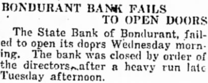 BONDURANT BANK FAILS TO OPEN DOORS The State Bank of Bondurant, failed to open its doprs Wednesday morning. The bank was closed by order of the directors,after a heavy run late Tuesday afternoon.