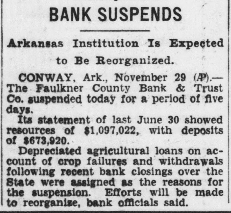 BANK SUSPENDS Arkansas Institution Is Expected to Be Reorganized. CONWAY, Ark., November 29 (P).The Faulkner County Bank & Trust Co. suspended today for a period of five days. Its statement of last June 30 showed resources of $1,097,022, with deposits of $673,920. Depreciated agricultural loans on account of crop failures and withdrawals following recent bank closings over the State were assigned as the reasons for the suspension. Efforts will be made to reorganize, bank officials said.