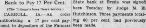 Bank to Pay 17 Per Cent. State bank at Breda was signed here Tuesday by Judge M. E. (The News Service.) CARROLL, order Hutchinson. Three payments totalauthorizing 17 per cent pay- ing 60 per cent had previously ment to depositors of the Farmers been made.