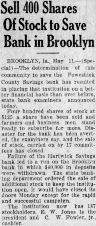Sell 400 Shares Of Stock to Save Bank in Brooklyn BROOKLYN, Ia., May 11.-(Special) determination of this community to save the Poweshiek County Savings bank has resulted in placing that institution on better financial basis than ever before, state bank examiners announced today. Four hundred shares of stock at $125 a share have been sold and farmers and business men stand ready to subscribe for more. Disaster for the bank has been averted. the examiners say, and the sale of stock, carried on by 17 committees has closed. Failure of the Hartwick Savings bank led to run on the Brooklyn bank in which $40,000 in deposits were withdrawn. The state banking department ordered the sale of additional stock to keep the institution open. It would have closed its doors Monday except for the rapid and successful campaign. The institution now has 187 stockholders. E. W Jones is the president and C. W. Fowler, jr., cashier.