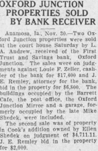 OXFORD JUNCTION PROPERTIES SOLD BY BANK RECEIVER ford Junction properties were sold at the court house Saturday by L. A. Andrew, received of the First Trust and Savings bank, Oxford Junction The sales were on judg ments against Louie F. Zeller, cashler of the bank for $17,400 and J. E. Remley, attorney for the bank, bid in the property for $6,800. The buildings occupied by the Barrett Cafe. the post office. the Oxford Junction Mirror and a garage. formerly occupied by the late Mike Shedek. were included. The second sale was of property in Cook's addition owned by Ellen Shedek on judgment of $4,711.11. J. E. Remley bid in the property for $2,000.