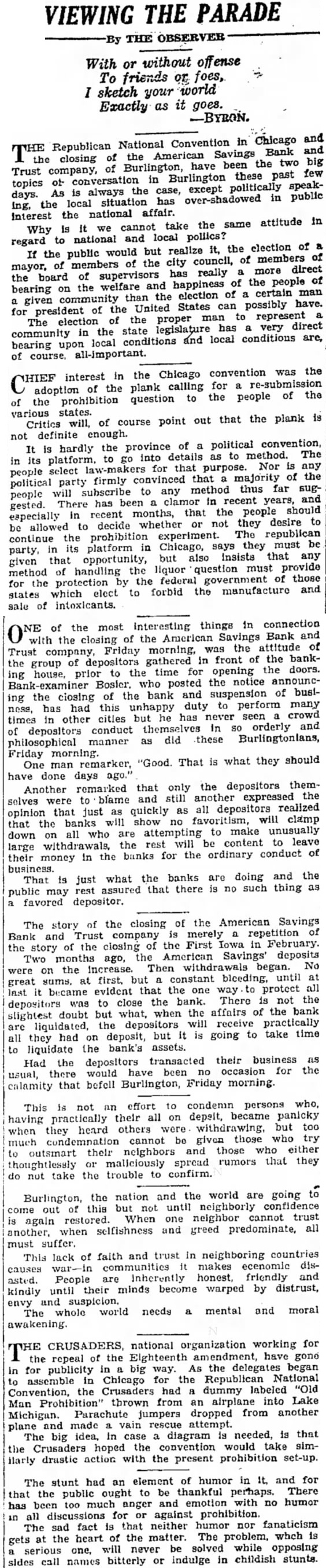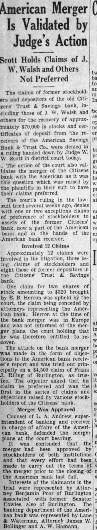 American Merger Is Validated by Judge's Action Scott Holds Claims of Walsh and Others Not Preferred The claims of former stockholdand of the old Citidepositors Trust Savings bank, of Walsh and cluding those others for the recovery of approximately $70,000 in stocks and tificates of deposit from the ceivers the American Savings Bank Trust Co., were denied ruling handed by Judge Scott in district court today. The action of the court also validates the the Citizens merger bank with the American it was this question which was raised by the plaintiffs in their suit to have their claims preferred. The court's ruling in the lawtried denies with two exceptions claims stockholders assets of the former Citizens' bank, part the American bank and the hands of the American bank receiver. Involved Claims Approximately 12 claims were the litigation, three claims of and eight those of former depositors in Citizens' Trust Savings bank. One claim for two shares stock amounting to $320 brought Herron upheld by the court, the claim being by the Amerbank. Herron the time bank merger Europe and not of the merin plans, the court holding that was therefore entitled cover. The attack on the bank merger made form objections to the American bank receivreport and was tried principally claim of Frank Riling Burlington, trusThe objector asked that his claim preferred and was the first the series claims and objections raised by various stockholders the Citizens bank. Merger Approved Counsel superintendent of banking and receiver in charge affairs the Ameribank, defended the merger plans the court that the merger had been approved stockholders of both and that every effort had been made to carry out the terms the merger prior the closing the American bank last fall. Interests of the claimants in the trial were represented by AttorPoor of Burlington associated with former Senator Cowles, also of Burlington. The banking department of the Ameribank was represented by Lane Waterman, Attorney James Bollinger and Hamann.