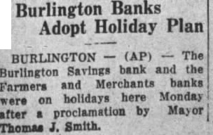 ? Burlington Banks Adopt Holiday Plan BURLINGTON (AP) The Burlington Savings bank and the Farmers and Merchants banks were on holidays here Monday after proclamation by Mayor Thomas J. Smith.